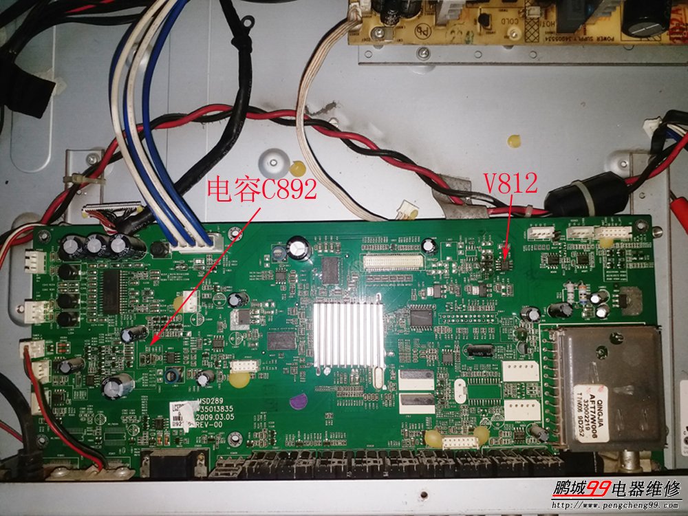 主板的12V供電可是供給多路DC-DC芯片的,又跟不到線路,看來要找到這12V到底是哪里短路還真要耗費點工時了。依據(jù)老習(xí)慣,還是先拆下主板,打開手電筒,用眼睛先對主板進行全面仔細(xì)地掃描一遍,一方面可以快速找到外觀上明顯燒壞的零件,另一方面可以對主板各個電路部份有個大概的了解。這還真是個好習(xí)慣,第一眼就瞄到了一個貼片電容外表有一絲裂縫,電容位號是C892,馬上用萬用表測量其阻值,0歐。用電鉻鐵拆掉這個電容后再次測量12V供電,沒有短路了。裝上主板后通電開機,“KONKA”的英文LOGO顯示出來了。裝好電視機,大功告成。本想著至少得花上一兩個小時才能找到問題的,沒想到半小時不到就解決了問題?磥,首先睜大眼睛仔細(xì)觀察電路板的各個零件還真是個良好的習(xí)慣,瞬間就可能意想不到的看出來問題。