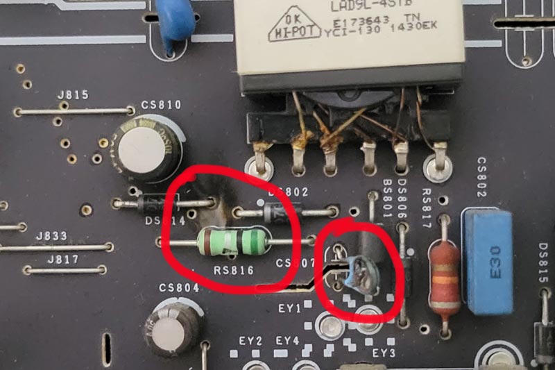回到維修店里來,拿著強(qiáng)光手電筒照著電路板一點(diǎn)點(diǎn)分析電路走向,花了半個(gè)小時(shí)終于又測(cè)量出好幾個(gè)元件損壞,位號(hào)ICS801C的電源芯片F(xiàn)AN6755的6腳供電對(duì)地短路了、短路燒了6腳的位號(hào)RS808/100Ω的供電貼片電阻,還有位號(hào)RS809、位號(hào)RS812、位號(hào)RS813的貼片電阻都炸掉了,電阻值也看不到了,只能嘗試找一下電路圖紙,看能不能找得到這幾個(gè)炸掉電阻的阻值吧。在百度搜索、各大維修論壇逛了好幾遍,就是找不到小米L49M2-AA的電源板圖紙。