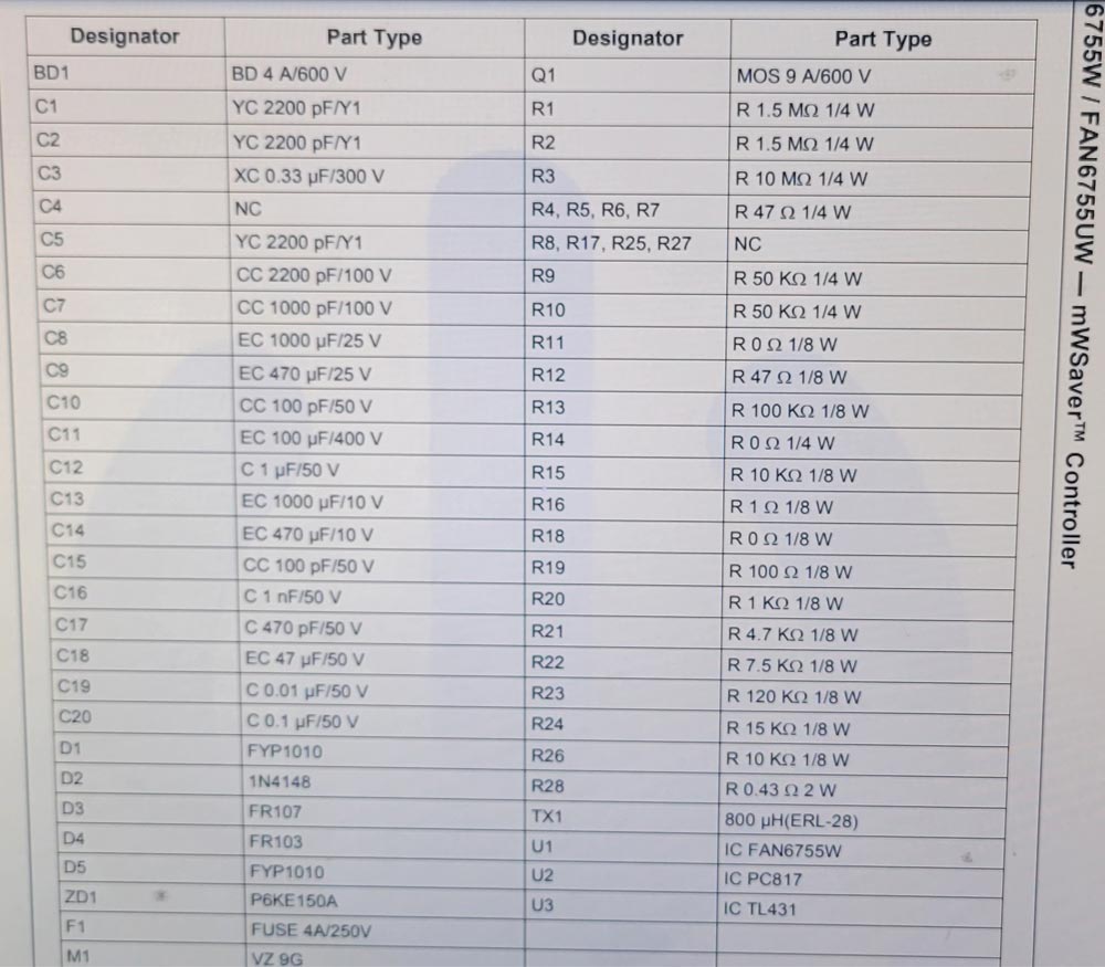 看來得另避蹊徑了,既然燒掉的這幾個(gè)電阻都是電源芯片F(xiàn)AN6755的外圍電路,那或許找FAN6755的典型應(yīng)用電路可以估測(cè)出這幾個(gè)燒掉的電阻的阻值吧。網(wǎng)絡(luò)上很快就搜索到了FAN6755的官方應(yīng)用電路,對(duì)照著炸掉電阻留下來的殘損數(shù)字,勉強(qiáng)判斷出位號(hào)RS809電阻的阻值應(yīng)該是22Ω、位號(hào)RS812電阻的阻值是10kΩ、位號(hào)RS813電阻的阻值是100Ω。找來幾個(gè)型號(hào)相同的元件焊上去,希望不要再出意外了。單電源板插上220V電測(cè)量輸出電壓,5V待機(jī)電壓出來了,給PS_ON 加上個(gè)開機(jī)電壓,12V供電也有輸出了。把電源板拿到用戶家裝上,電視機(jī)能正常開機(jī)了。