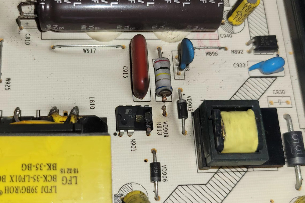 但還是拆下電源板仔細測量了相關電路,6.3A保險絲燒掉、整流橋堆已擊穿損壞、除了電源芯片已炸掉外,引腳被熔斷的200K電阻并沒有壞掉,看來只是被電源芯片炸裂時的高溫熔斷了引腳;變壓器也沒有損壞,只是被高溫把外觀燒黑了。但是電源芯片已經炸裂掉,看不到具體型號了。當場在網上搜索到了這個電源芯片型號是TNY287,但是我零件盒里面沒有這個型號,只有TNY290,不知道能不能代用。又搜索到了TNY287和TNY290的資料,對比一下,應用電路是一模一樣的,只是TNY290的功率比TNY287要大一些,應該是可以代用的。把所有壞的元件全部更換掉,順便在300V大電容到待機電源變壓器之間的跨接導線(位號W917)更換成了一個2A的保險管,至于為什么要加這個保險管,我認為海信電視電源這個設計是有瑕疵的,以前多次維修到待機電源芯片炸掉時都會燒壞變壓器初級線圈,而這次是擊穿了整流橋堆,由于主保險管6.3A太大,短路電流在熔斷主保險絲之前就先把其它零件燒壞了,所以我加一個2A保險管,以防電源芯片再次擊穿時會燒掉變壓器或整流橋。