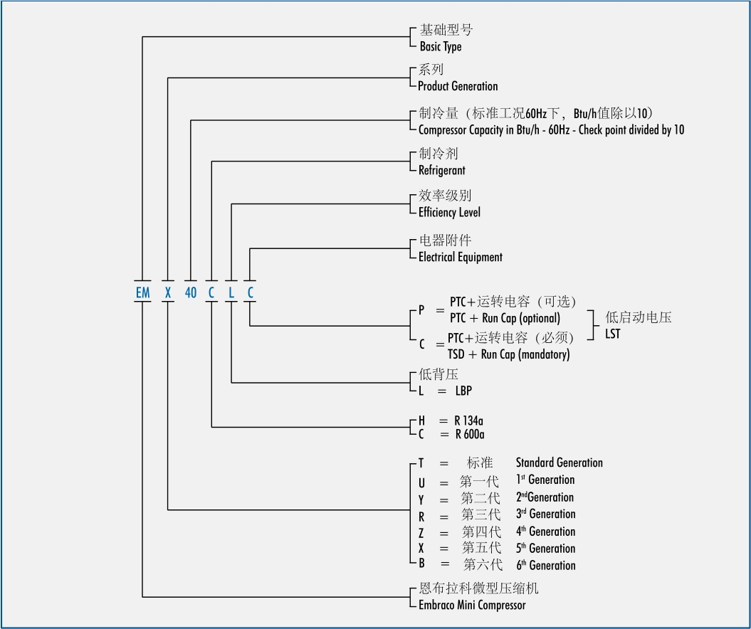 恩布拉科壓縮機型號命名規(guī)則方法: