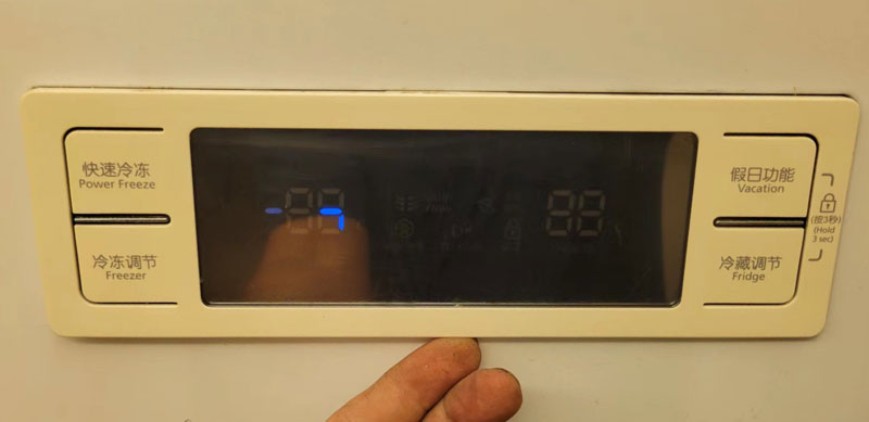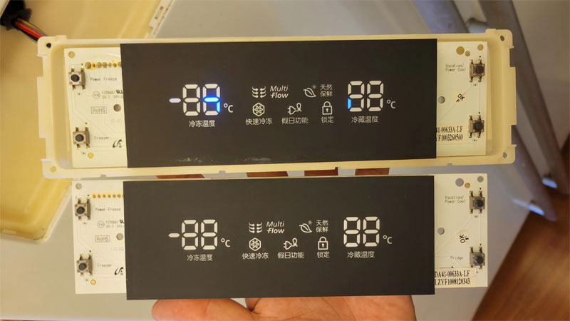 第一次維修三星對開門冰箱時(shí),修完冰箱之后再插電顯示變成這樣了,修冰箱之前顯示還是正常的,我還以為是顯示板壞了,不得已又買了一塊同樣的顯示板裝上,如下圖: