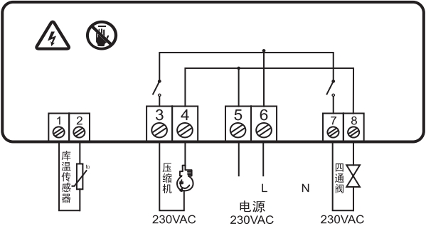 6、繼電器出點容量:壓縮機:50A/240VAC 最大能驅(qū)動單相5HP/240VAC的壓縮機負載 四通閥:5A/220VAC