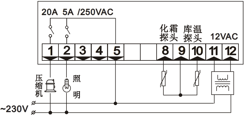 壓縮機(jī):常開20A/250VAC(可直接用于匹壓縮機(jī),超過要接交流接觸器)照明:常開5A/250VAC